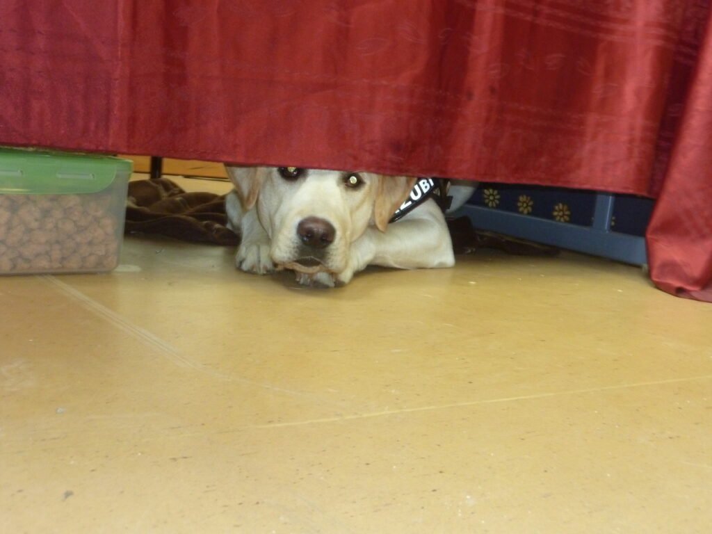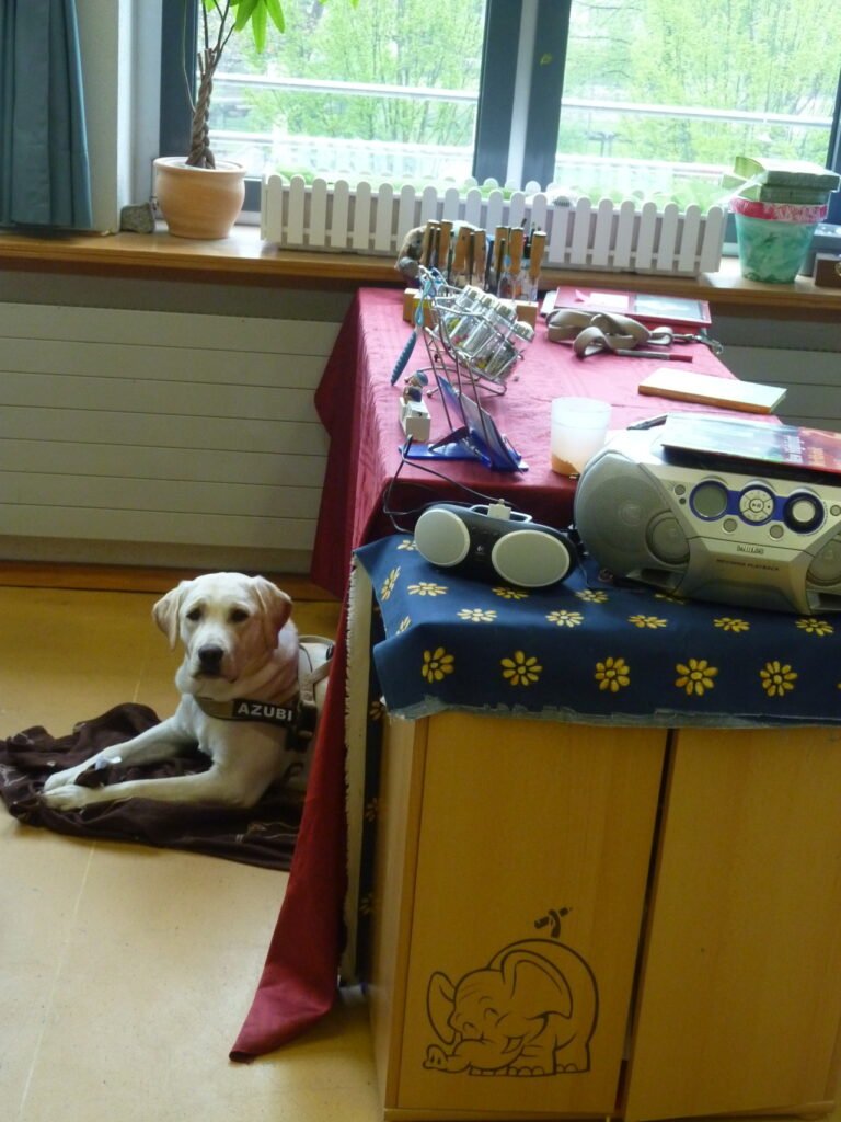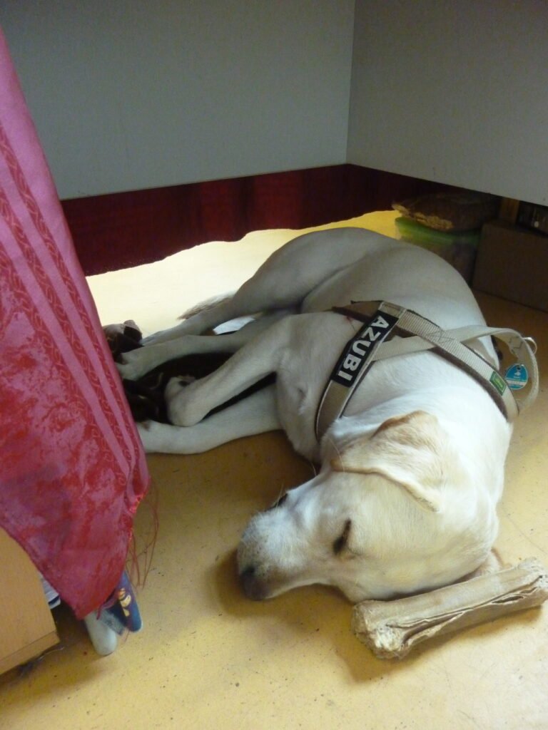 Wenn es mir doch mal zu viel wird, dann lege ich mich hinter das Lehrerpult. Dort habe ich meine Ecke bzw. meine Höhle darunter. Dann noch einen Kauknochen und ich bin glücklich und schlafe sogar häufig ein 🙂
