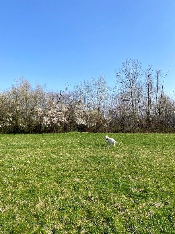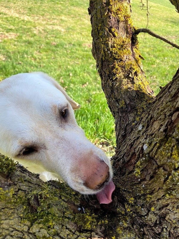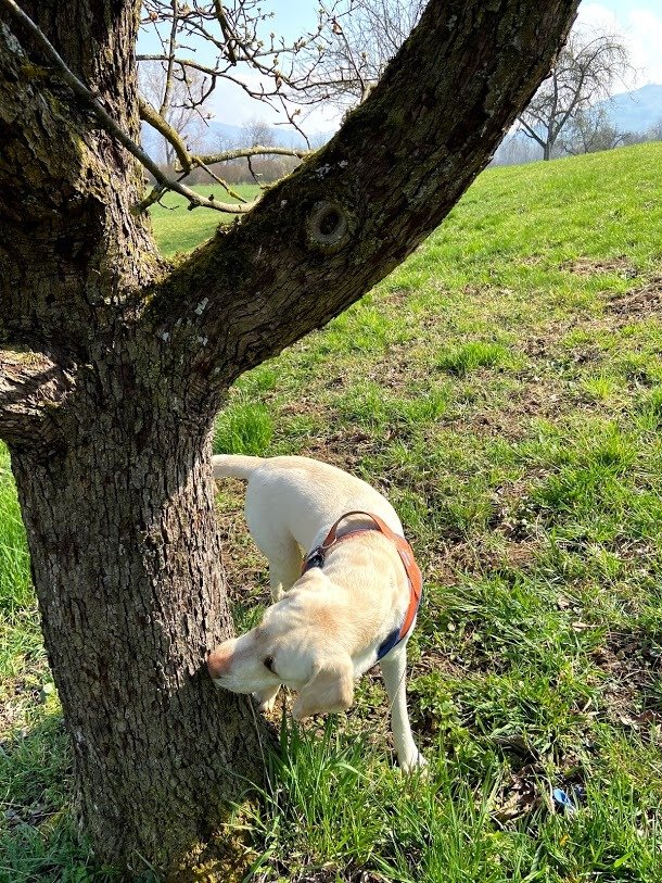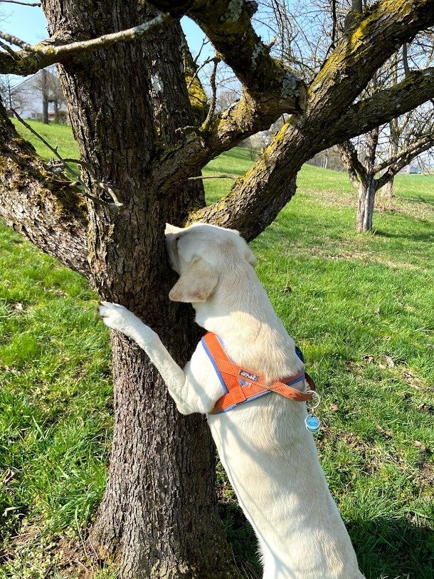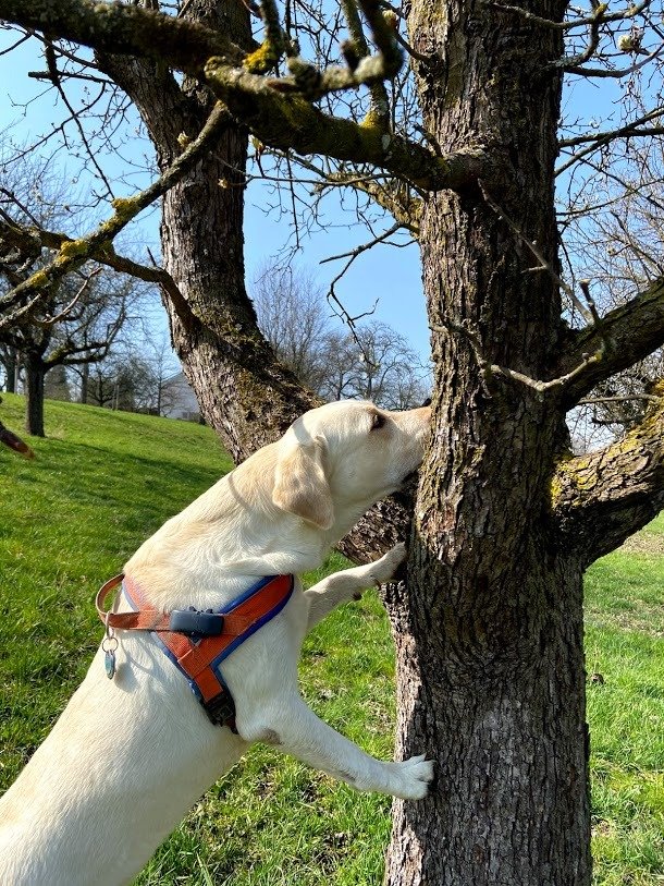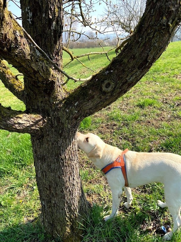 Wir wohnen in der Nähe von Feldern und Bächen, so dass ich viel mit Herrchen laufen kann. Auf den Bildern seht ihr, wie ich meine Nase trainiere und Leckerlis im Baum suche. Die sind manchmal fies versteckt.
